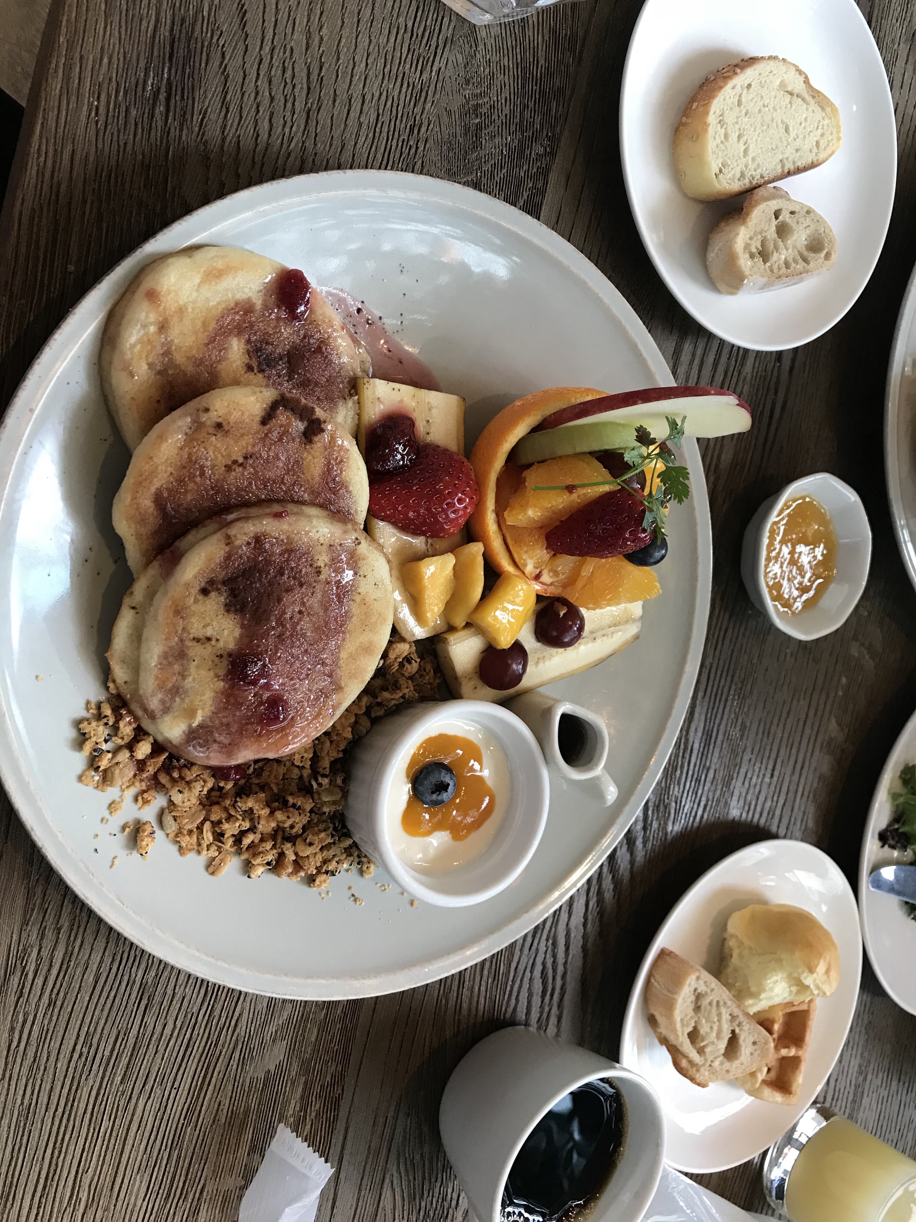 パンは米粉、この日選んだパンケーキも大豆の粉で出来ています。更にヨーグルトも豆乳から出来ていて、コーヒーに入れるのも当然のごとく豆乳です。