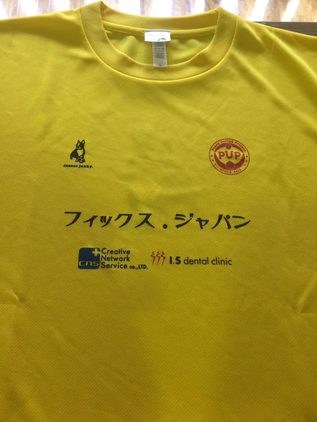 先日、友人が主宰する子供サッカーの非営利団体に若干の寄付をさせていただきましたら、練習用Tシャツに当院ロゴを入れてくださいました!