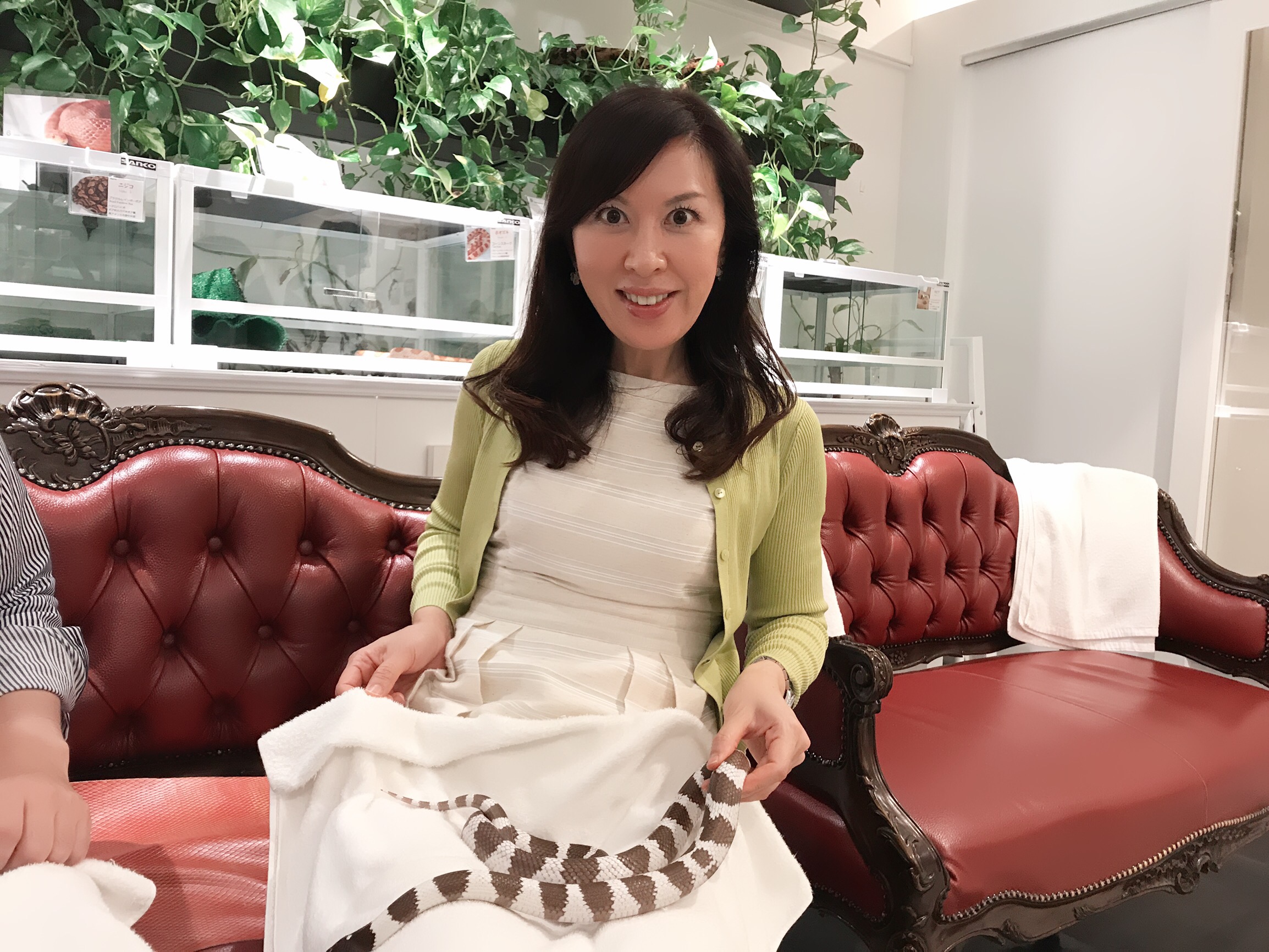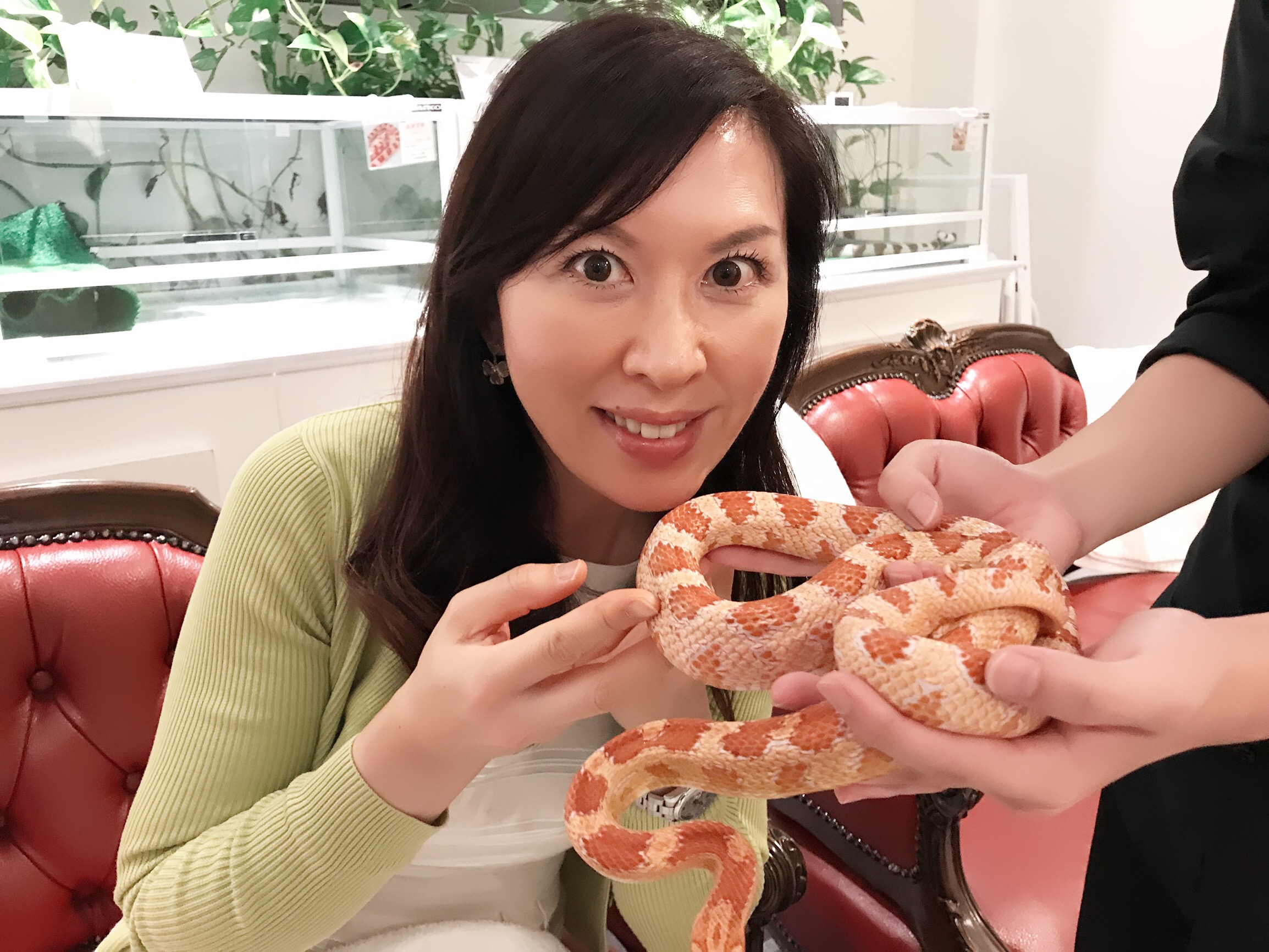 スネークセンターでは、好きなヘビを触ることが出来たり、ケース入りのヘビを見ながらお茶することも出来ます*\(^o^)/*