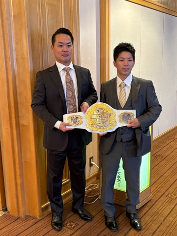 向かって右な小柄な方がチャンピオンです。小さな身体ですが、眼光鋭く、いかにも強そうな感じがしました。左の方は彼のスポンサーをしている社長様です。