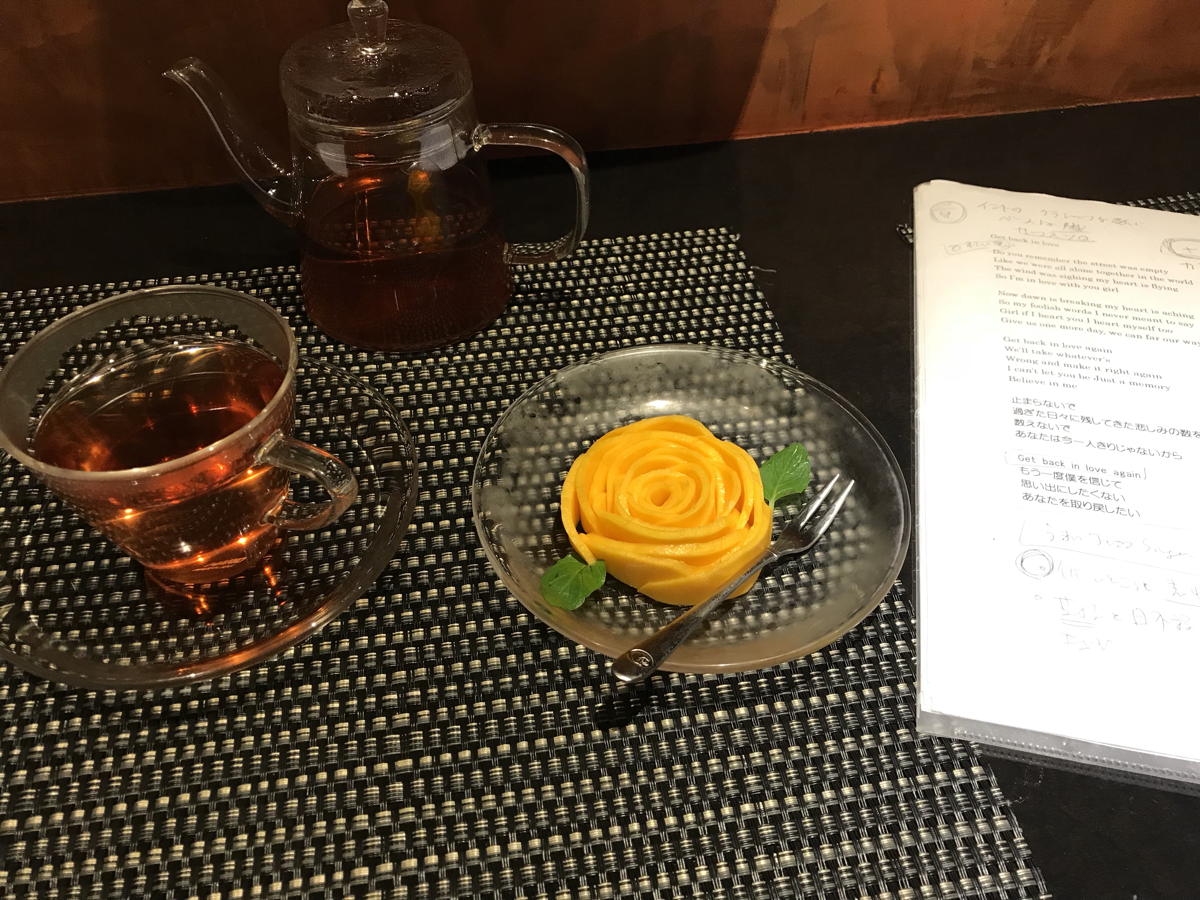 写真は、峯岸プロデューサーの経営する千鳥町のリビングというカフェでの、峯岸さんの奥様の手作り、プロの技、カットマンゴー!