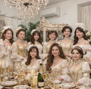 これは先日、尊敬する女性経営者の馨社長のご自宅で行われた新年会の時の集合写真です。私は上段の右端ですが、もちろん実際にはヘッドドレスもドレスも着ておりません、全部がアプリでの変身です。