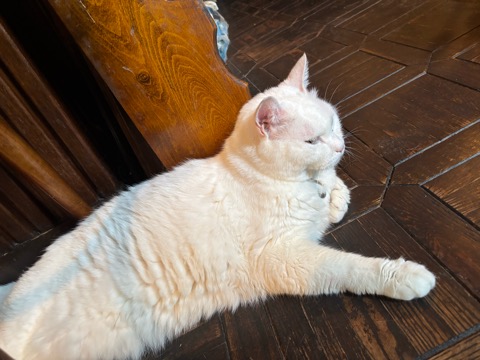 白くて大きくて、おとなしくて可愛いのですが、構われるのが嫌みたいで、なでなでするとどこかに隠れてしまうのです。