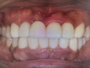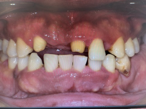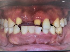 写真は正面観で、前歯ももちろん瀕死の状態でしたが、奥歯がもっと重症で、食いしばりが酷いために歯周病が悪化して4本も抜かなければいけない状態でした。