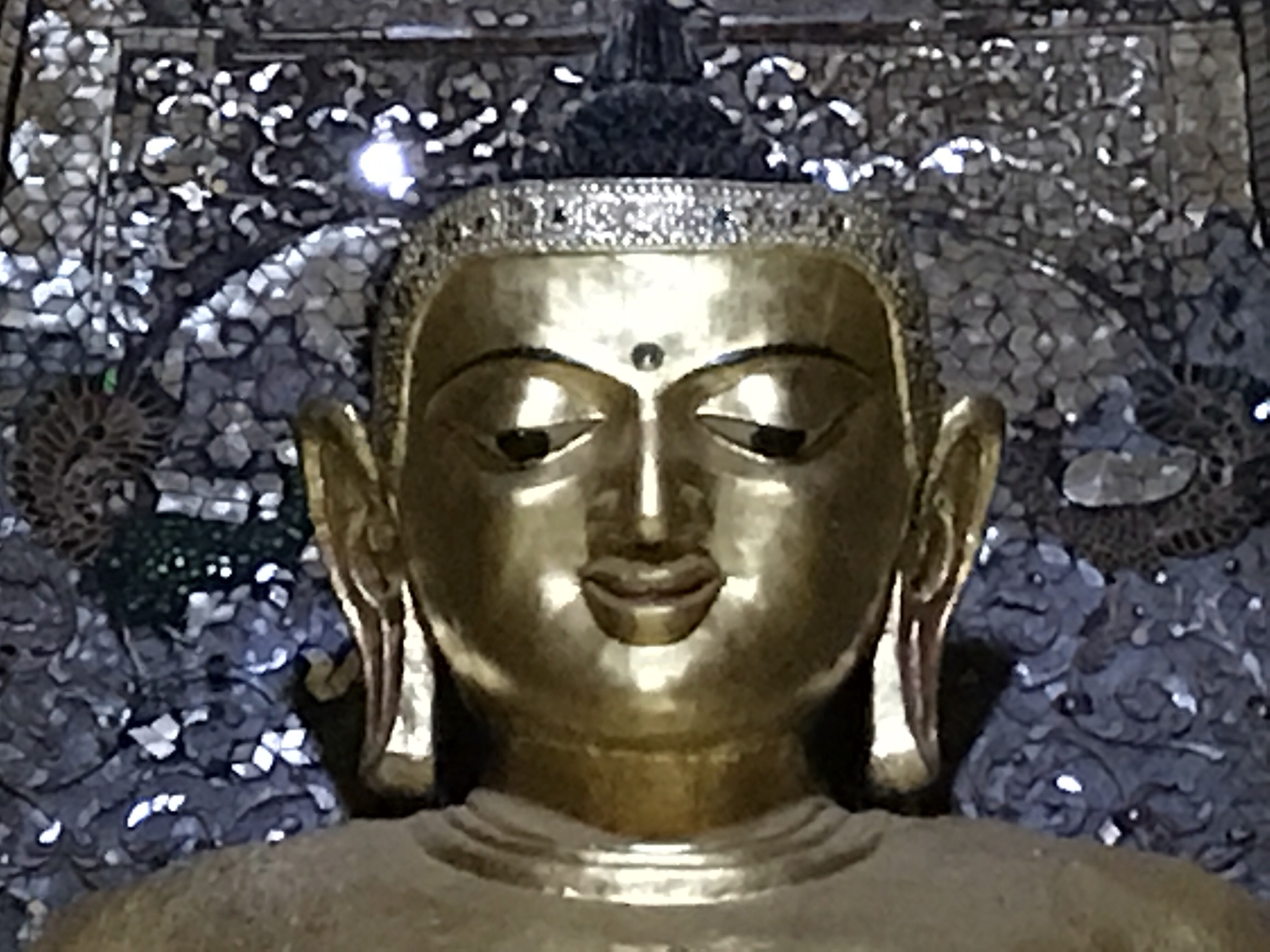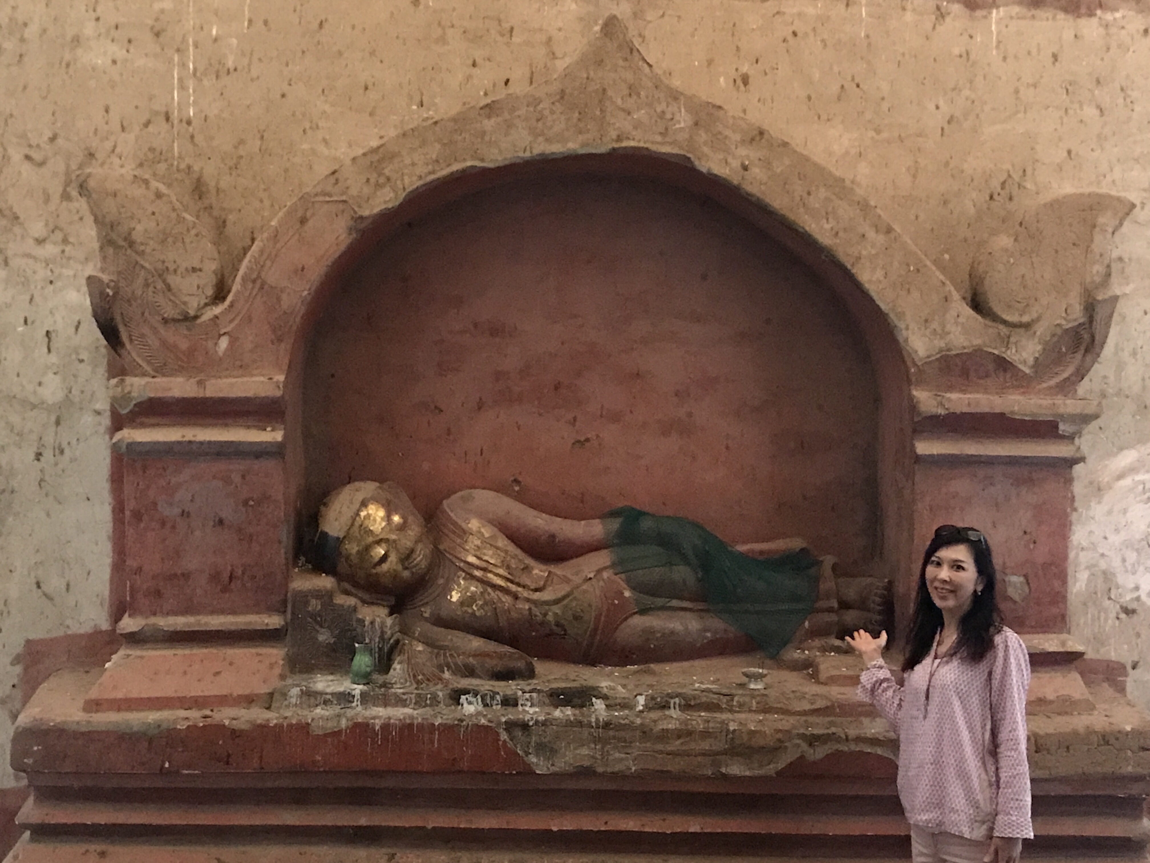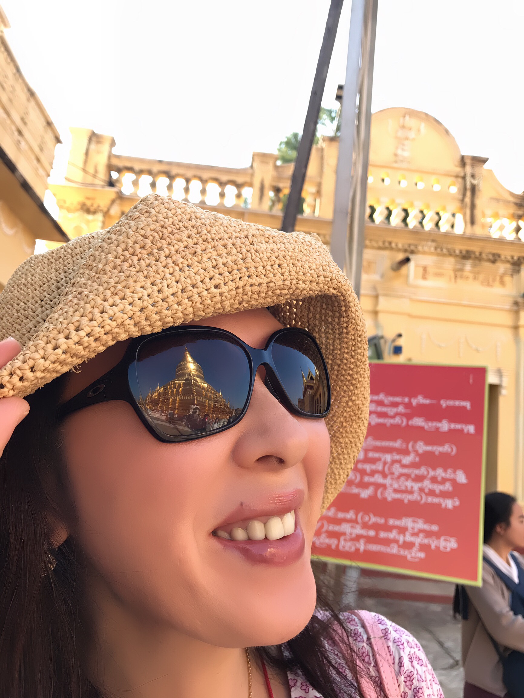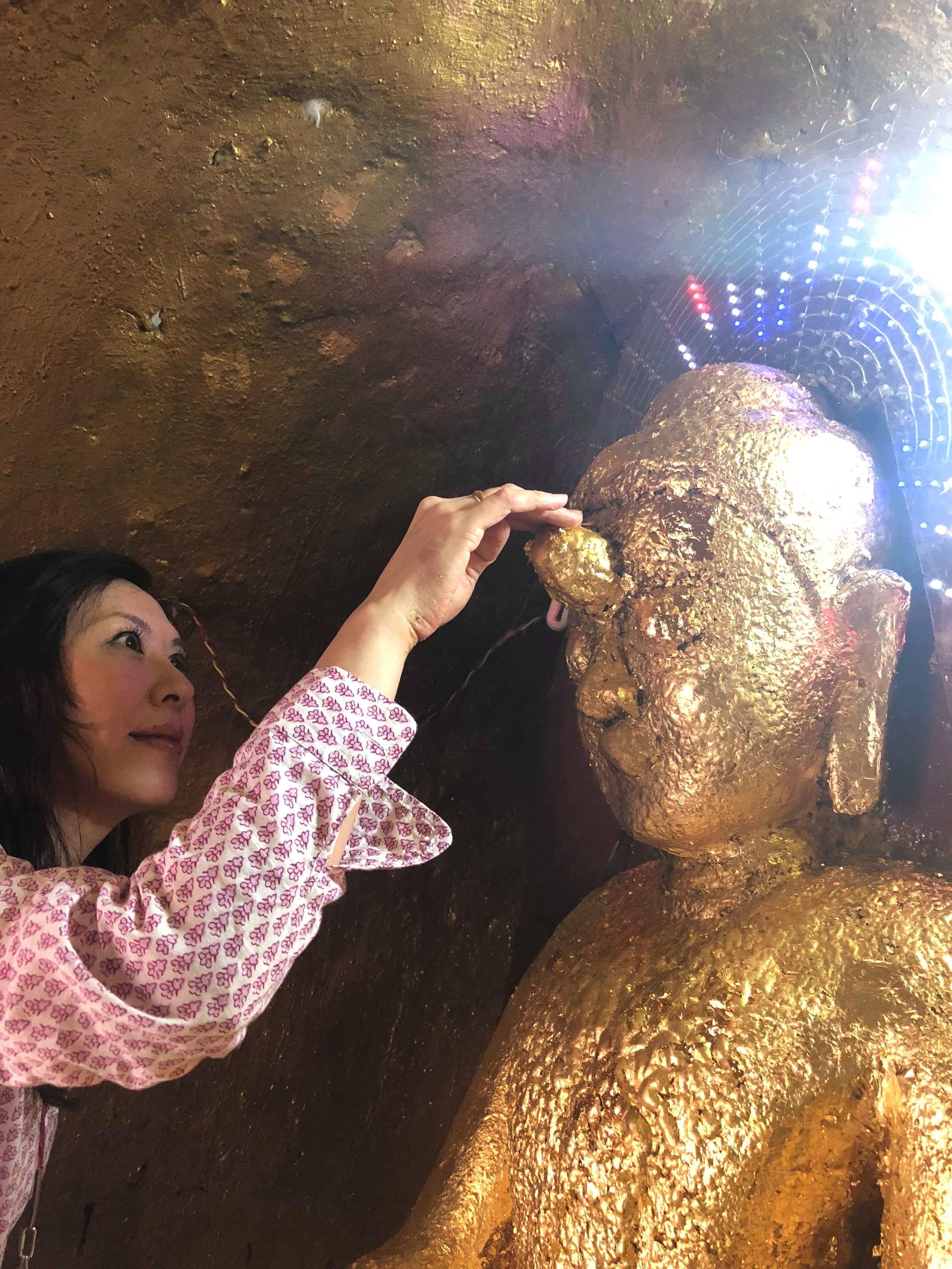 私のサングラスに映っているのが、その寺院です。お釈迦さまには金箔が張ってあるのですが、数体のお釈迦さまには自分で金箔を張れるところがあり、お釈迦さまの身体の場所によって受けられる御利益も違ってくるようです。